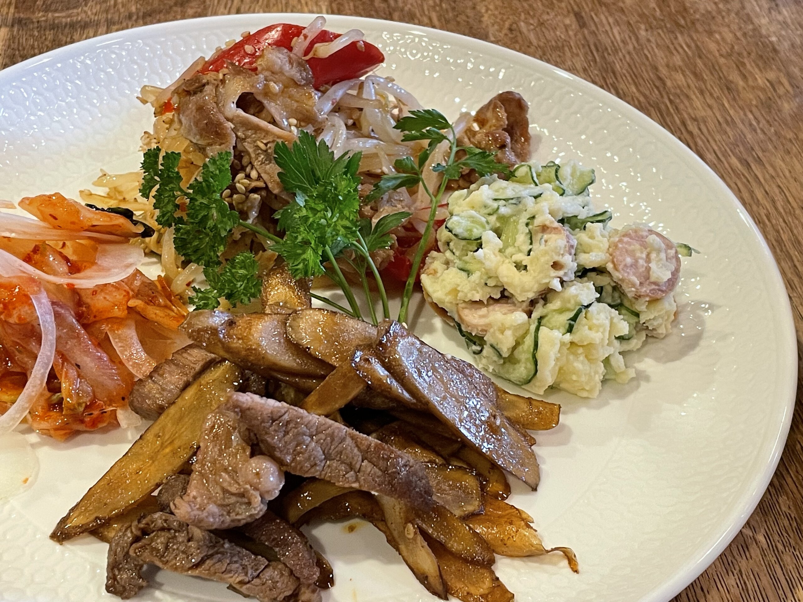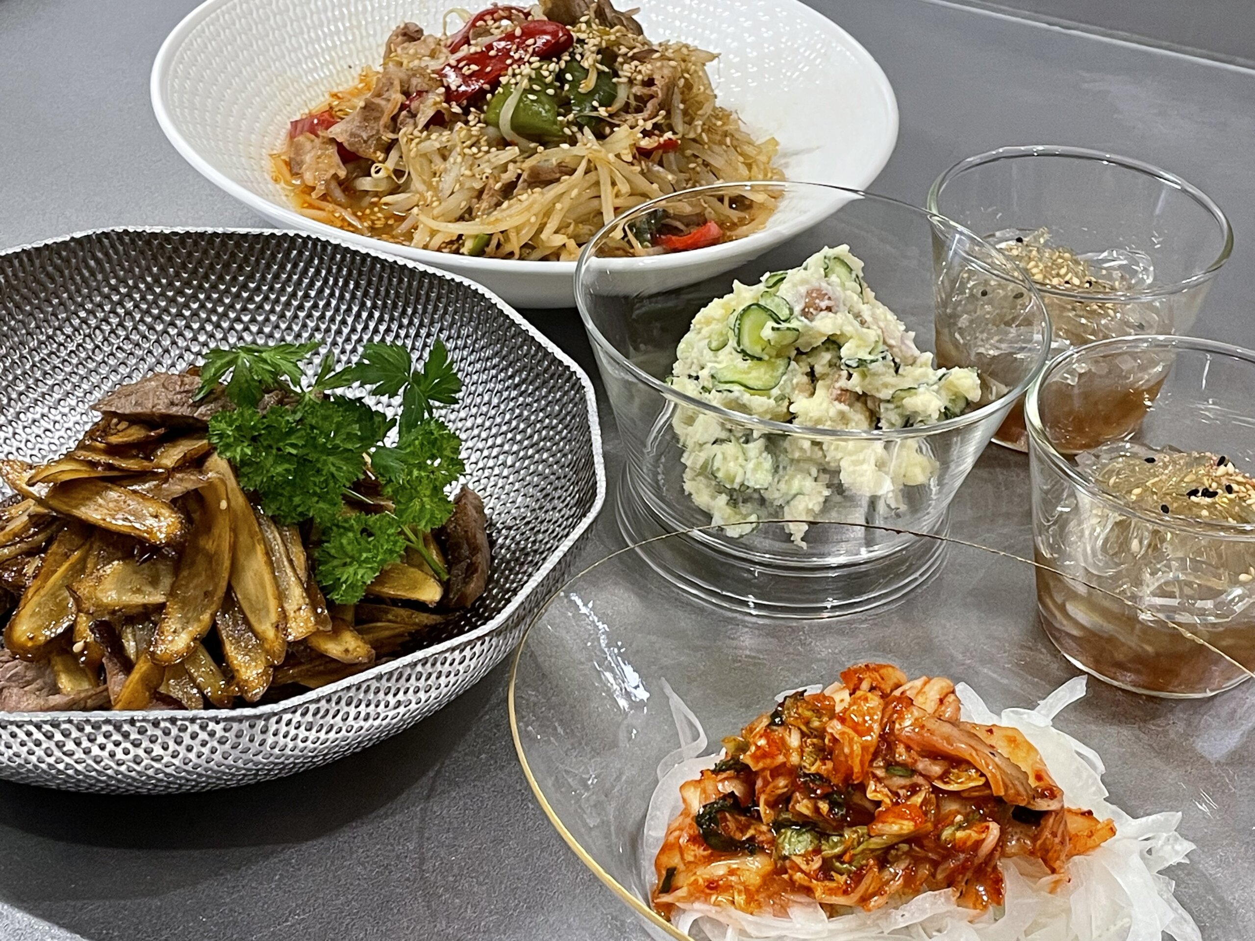 ポテトサラダは翌朝のサンドイッチの具に、もやし炒めは韓国風チャンポンに、牛肉と牛蒡の焼肉のたれ炒めは刻んでチャーハンの具などアレンジすることも楽しいし、常備菜として翌日の小鉢にも利用します。