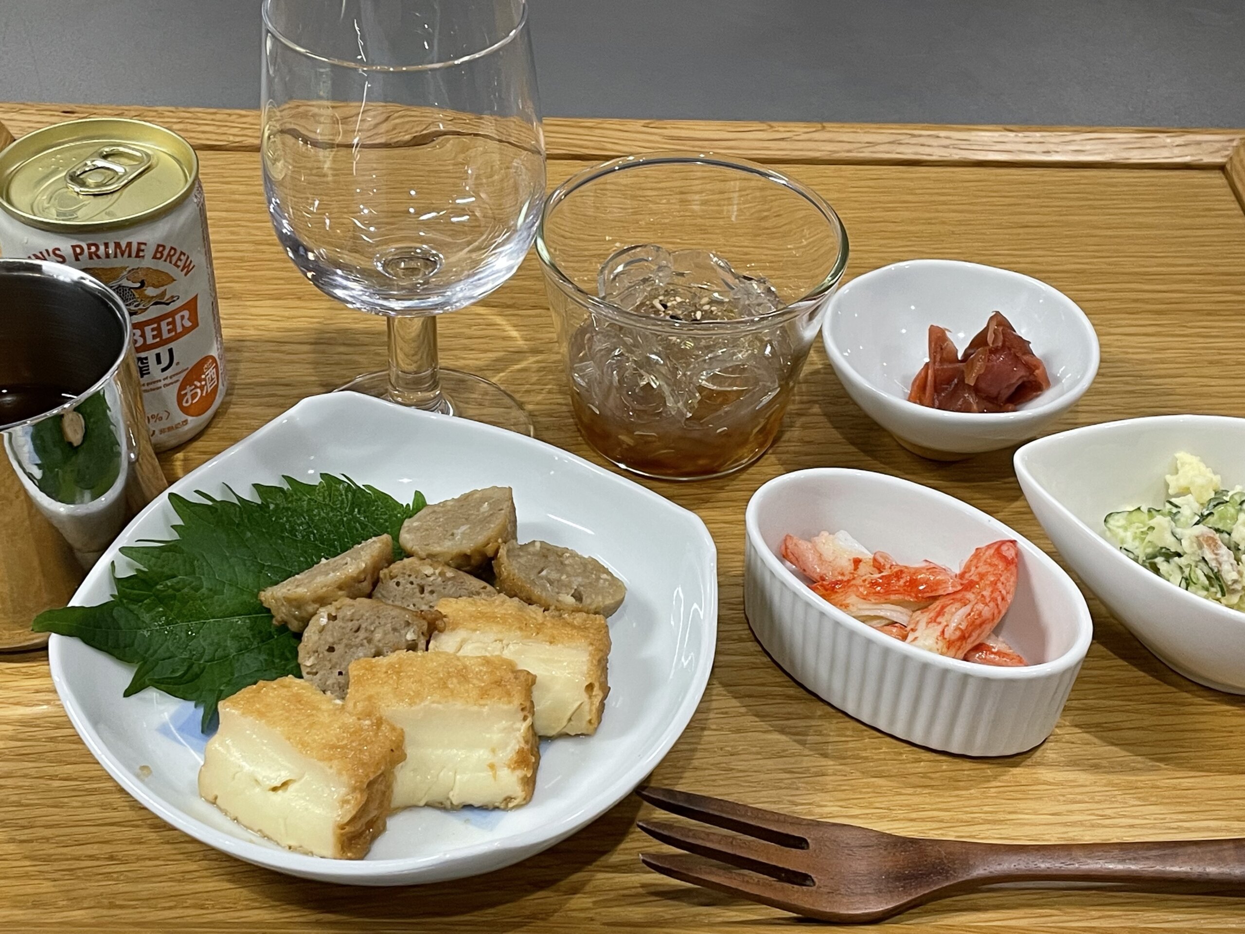 母には厚揚げとチキンボールの煮物、カニカマのポン酢和え、ポテサラ、トコロテン、梅干し。夕食だとわかるようにビール!笑