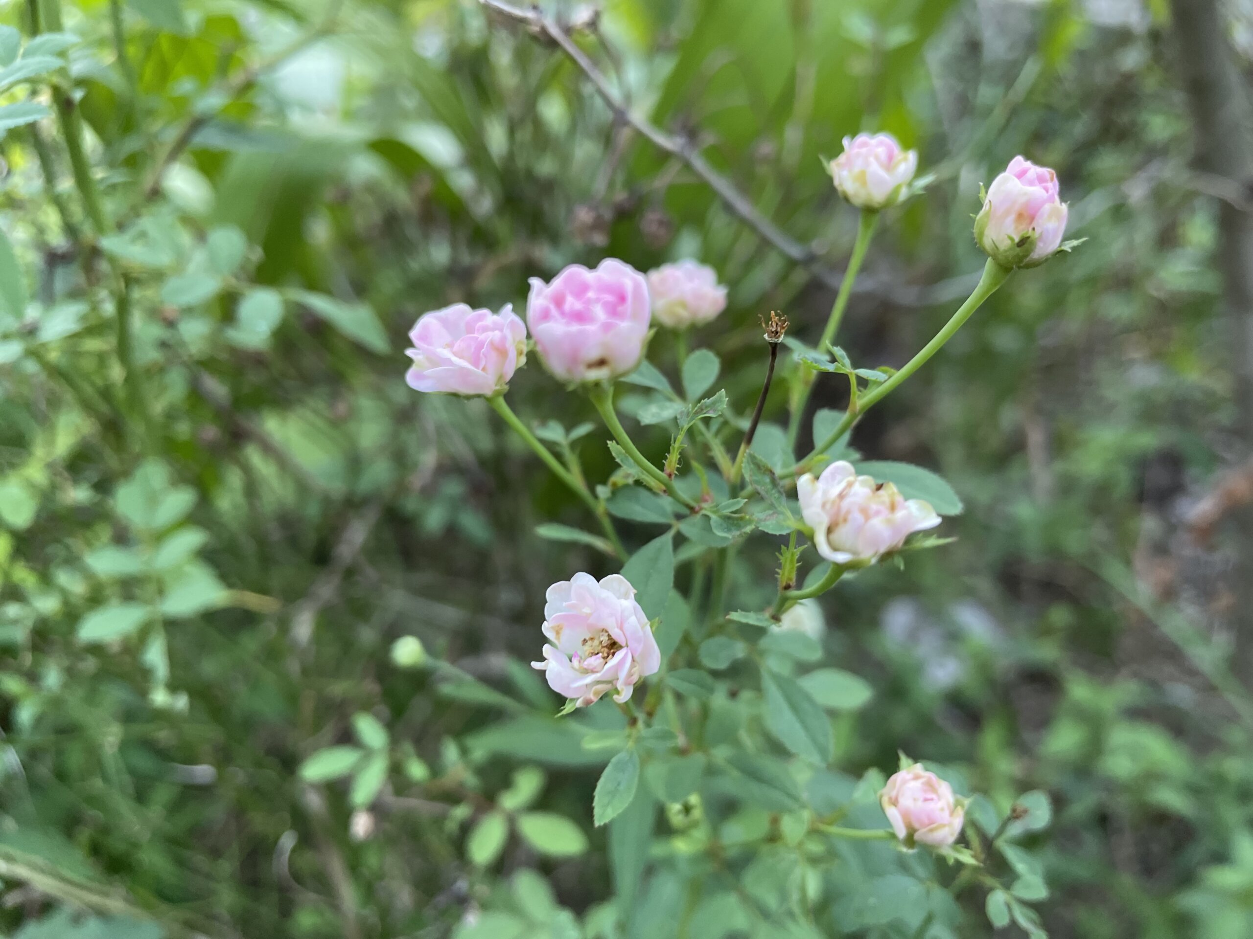 庭の片隅で雑草に埋もれながら健気に咲くミニバラ🌹手入れして咲き誇らせてあげたい。