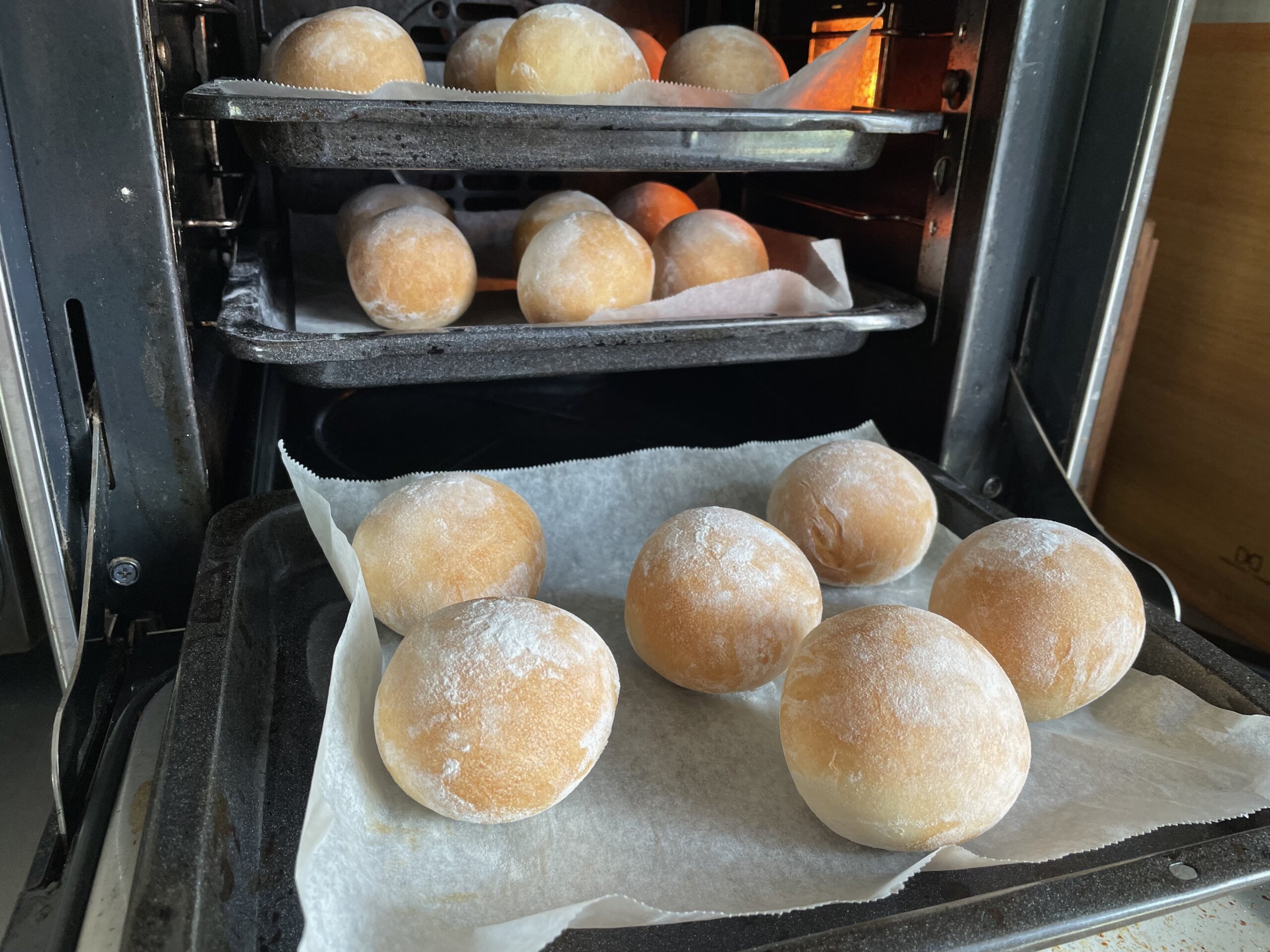 最近パンは自家製です。今日はプチパン。コロンとした形で成形は丸めるだけの簡単パン。夫にはベーコンエッグなどのサンドイッチ式が多いかな。