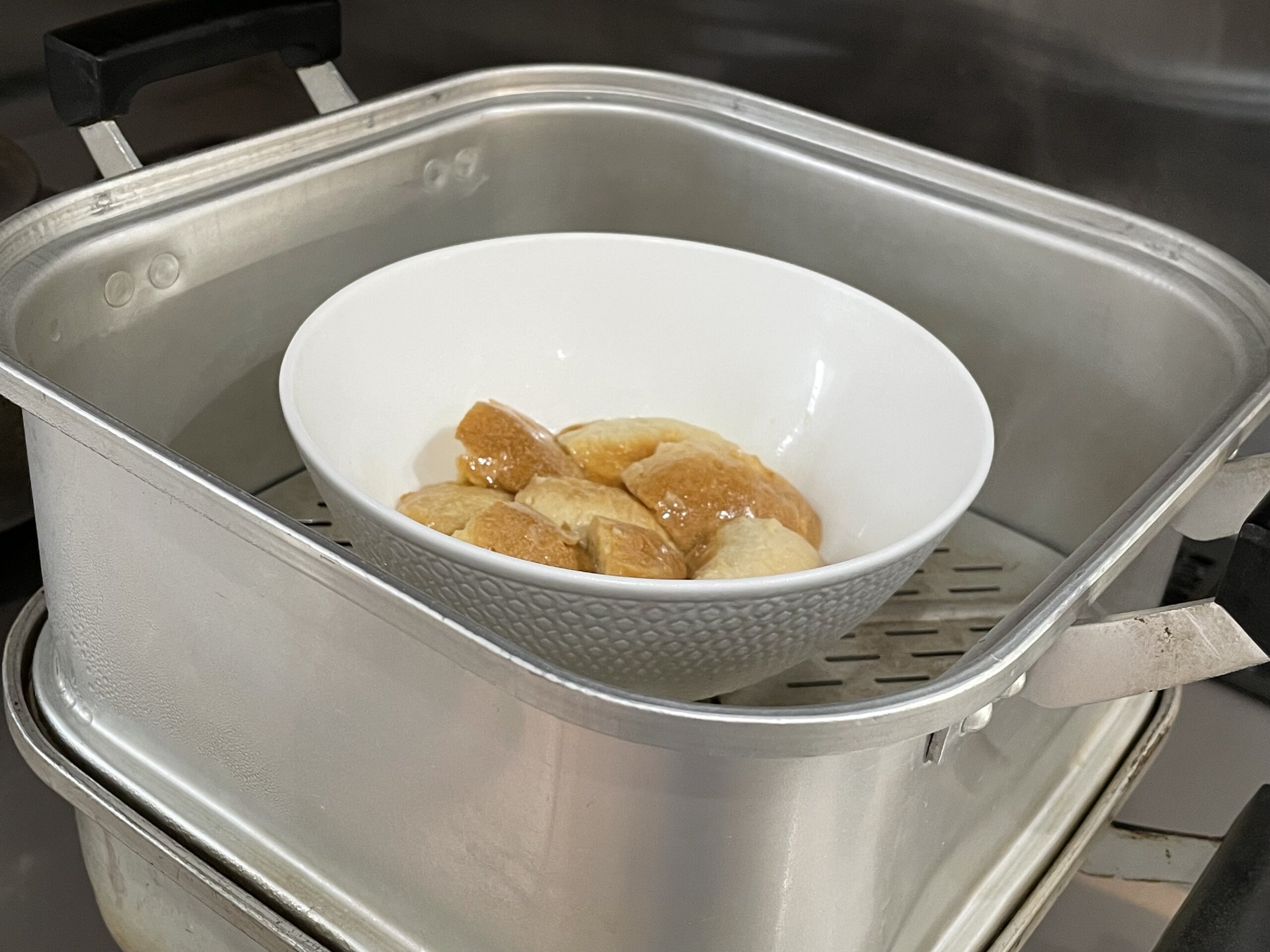 このプチパン、バターも砂糖も少ないのでカリッとした焼き上がりになるため、母にはフレンチトーストにすることが多い。今朝は卵液に浸す時間が足りなくて茶碗蒸しみたいに器ごと蒸し器で蒸しました。小さなプチパンが結構なボリュームに。