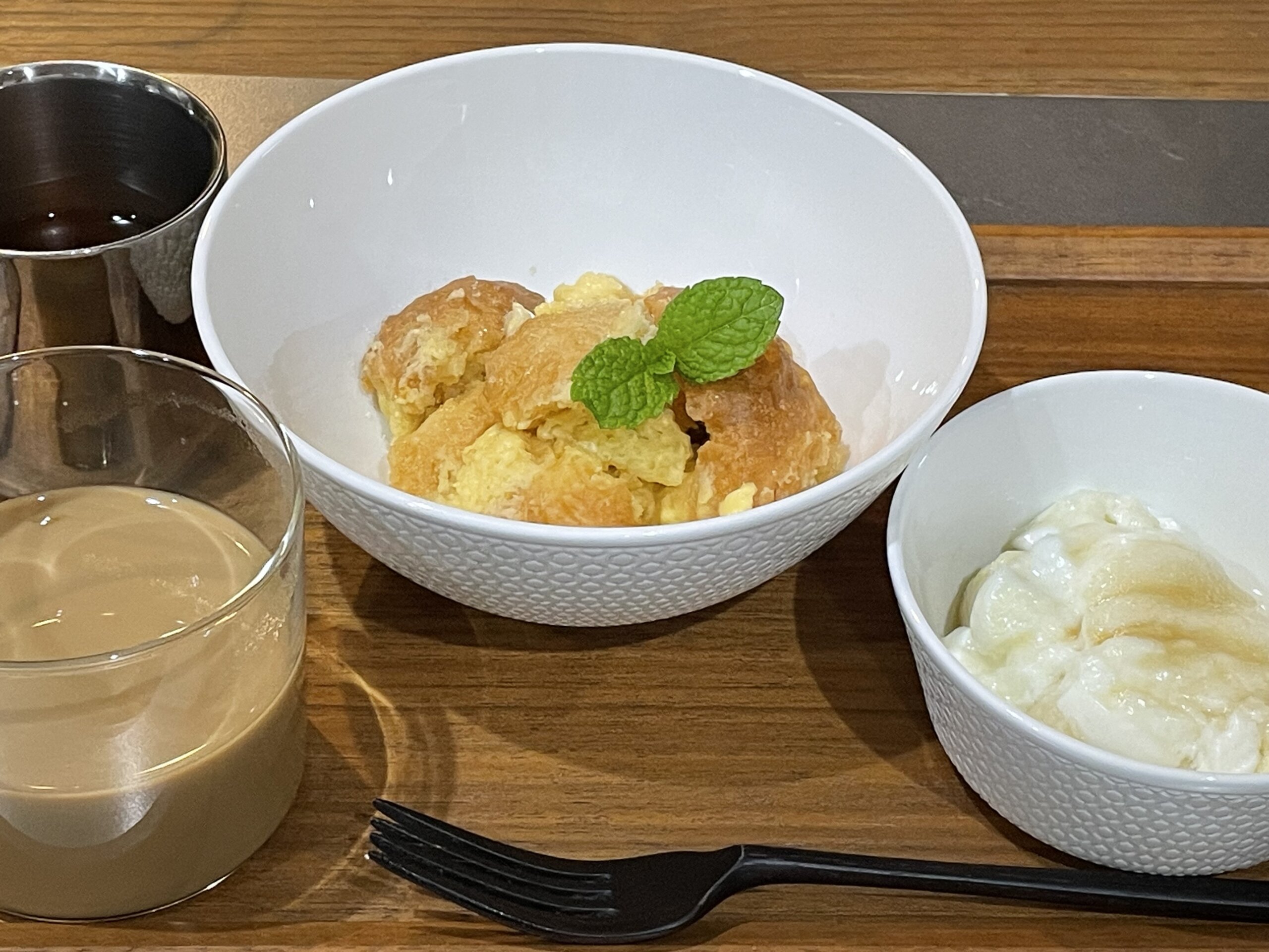 母の朝食:蒸しフレンチトースト、バナナヨーグルト、カフェオレ。完食しました。