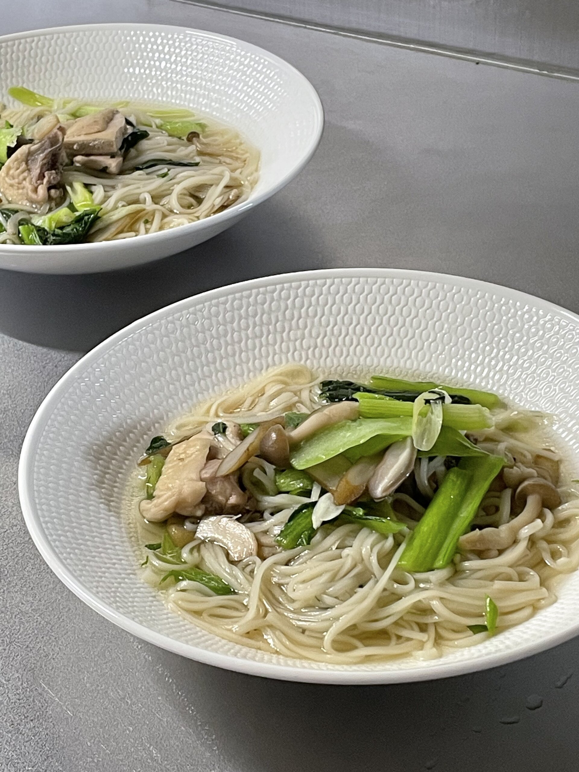 乾麺を茹でている間に 別鍋に鶏肉、ゴボウ、自家製麺つゆと水を入れて火にかける。煮立ったら味を見て、薄かったら麺つゆを足し濃かったら水を入れて薄めて味を整える。茹で上がった麺を加えて、ネギ、小松菜を加えて少し煮込んで完成。具材は全て自家製冷凍。麺も冷凍があれば鍋は一つで完成します。
